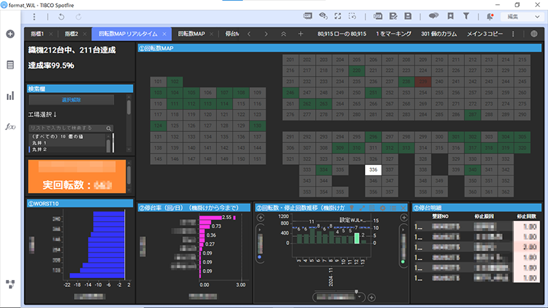 大橋氏:約1,100台の織機の稼働状況がマップやグラフでパッと確認できるところが、とても気に入っています。稼働状況が見える化されたこと、それだけでも大きな意味がありました。また、現場の課長や織機調整者と、ダッシュボードを見ながら「ここおかしいね」「ちょっと見てこようか」とスピーディーにやりとりができるようになった点も有難いですね。これまでは織機調整者のカンに頼って手探りで織機の調整をしていた部分があったのですが、Spotfireを導入したことによって、データに基づいて行動できるようになりました。