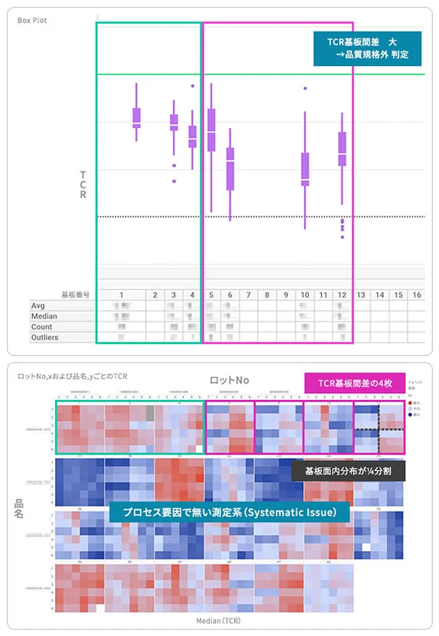 具体的な事例で言いますと、不具合の調査を行ったときのこと。まとまった数の基板が、連続して、すべて最終的に不良として弾かれていたことがありました。これはなんでだろうと検査データを確認したところ、確かにすべての基板が、単純に規格外の数値になっていたのです。これまでは「確かに規格外だね」ということで終わっていたのですが、ここをもう少し詳しく見てみようということになり、Spotfireで、基板内のTCR特性をヒートマップ化してみました。すると、本来は基板内の面内分布がある程度均一もしくはグラデーションのような状態になっていなければいけないはずなのに、1枚の基板右側のTCR特性がプラス方向に振れていることを示す赤っぽい色で表示され、左側がマイナスを示す青色傾向になったことにより、基板内が4分割されている特異性が確認できました。