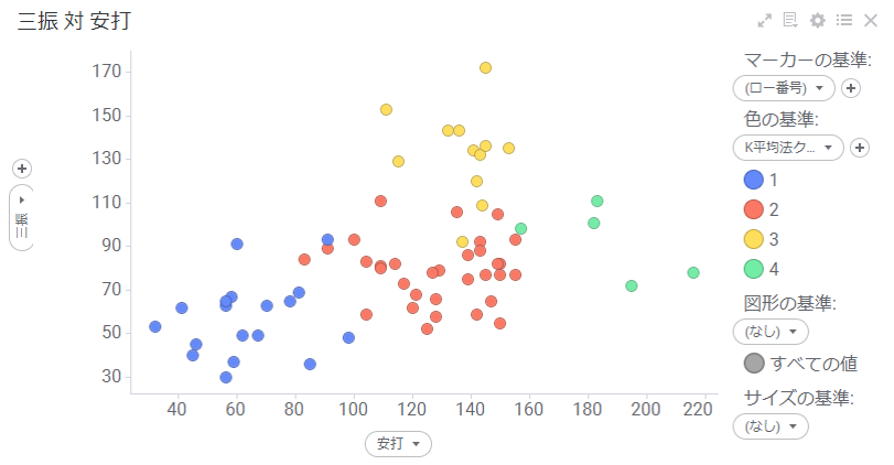 散布図をみると、この4つのグループは、「三振」と「安打」の組み合わせにより、ある程度グループ分けがされていることがわかります。