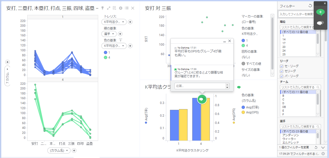 +ボタン付きの吹き出しをクリックすると、画面上にアイコンが出現します。棒グラフの上で「平均打率もOPSもグループ4が最も高い。」とコメントを書き、投稿をクリックします。