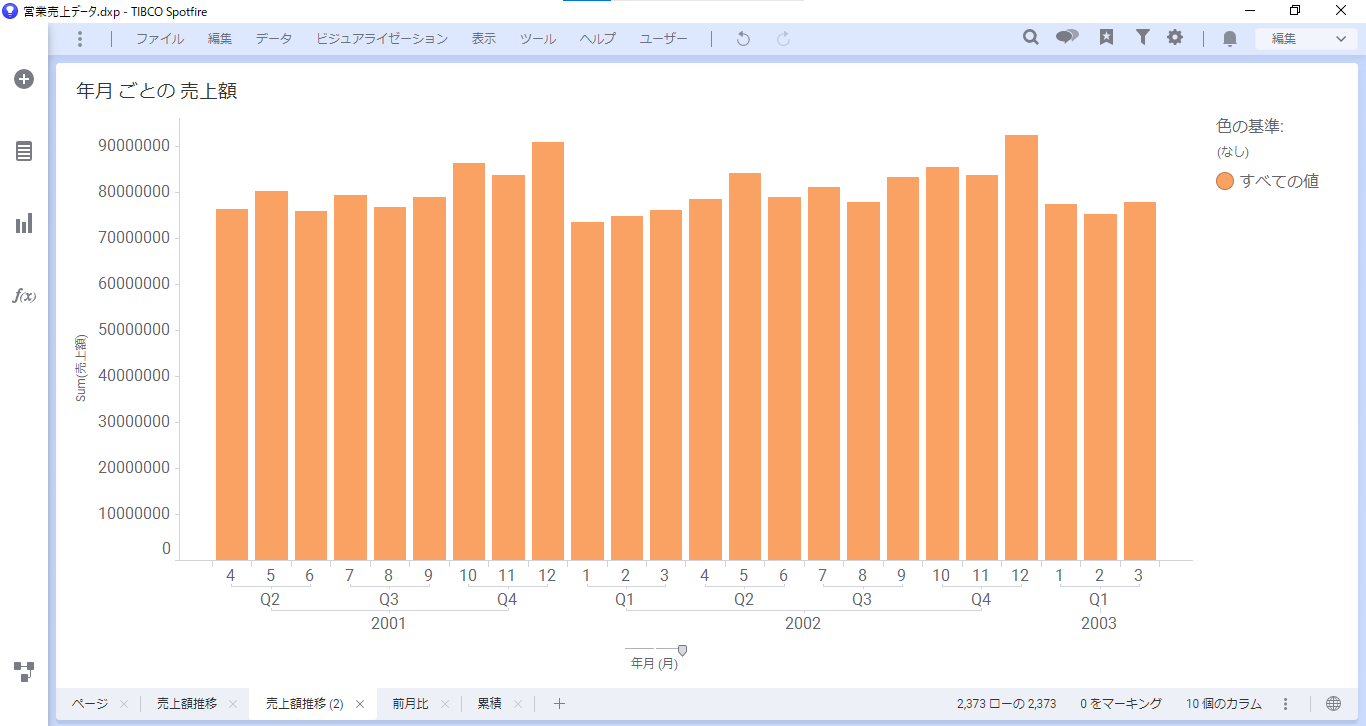 売上額の推移のグラフを基にして、Y軸のカスタム演算式でNode Navigationを変えていきOVER関数の使い方を学びます。