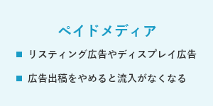 ペイドメディアには、検索結果に表示されるリスティング広告(検索連動広告)や、ポータルサイトなどに広告用の画像や動画を表示するディスプレイ広告などが含まれる。広告費の算出基準には、広告の表示回数を元にするインプレッション課金、広告をクリックされた回数を元にするクリック課金がある。どちらの場合も、広告出稿をやめると自社サイトやランディングページへの流入がなくなってしまう点には注意が必要である。