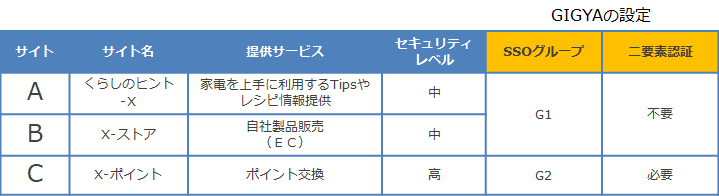 この場合、サイトA主に情報提供やキャンペーンのためのサイトなので、ログインは簡単にしておく必要があります。一方で、サイトCはポイント交換=換金に近いサービスになりますので、セキュリティレベルは上げておきたいですし、ユーザもその方が安心して利用できます。これを実現するためには、表3のようにSAP Customer Data Cloud from GIGYAを設定します。