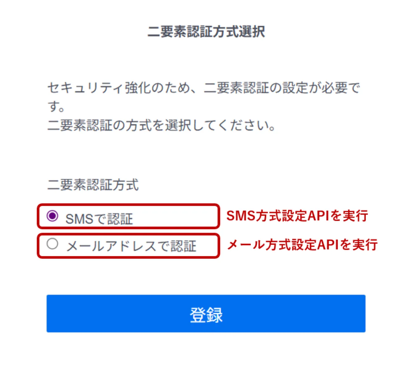 - 新規登録時にメールとSMSのどちらでTFAを行うかユーザ自身に選択させ、次回以降のログイン時にはその方式でワンタイムパスワード(OTP)を送信する。