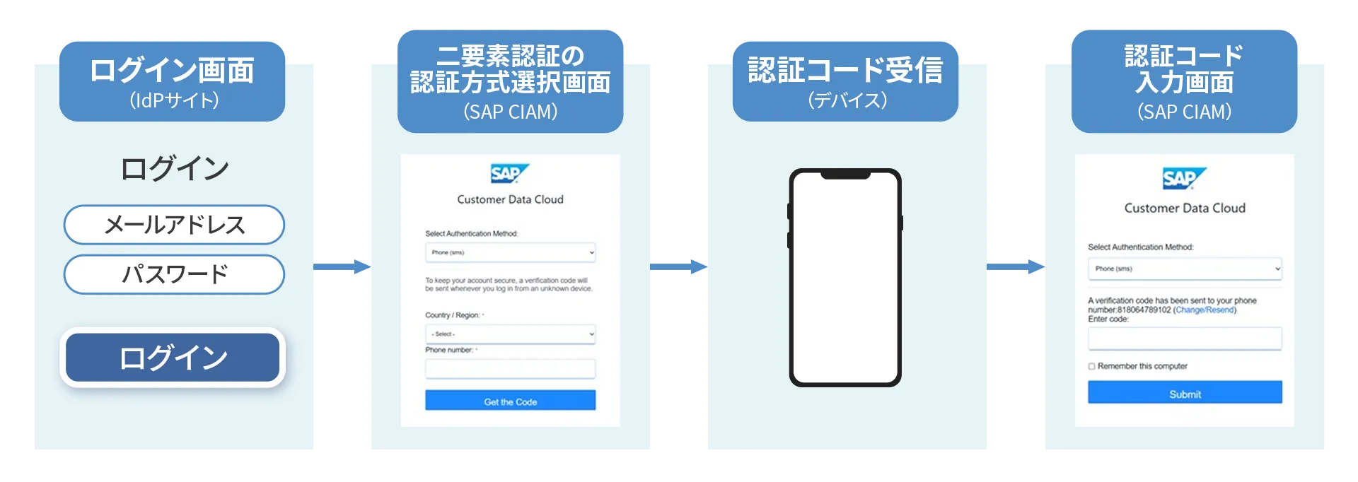 ※認証方式(認証コード受信方法)は、SMS認証とGoogle Authenticatorなどを使用したワンタイムパスワードでの認証方式を選択可能 - ②で選択した認証方法で、認証コードを受信