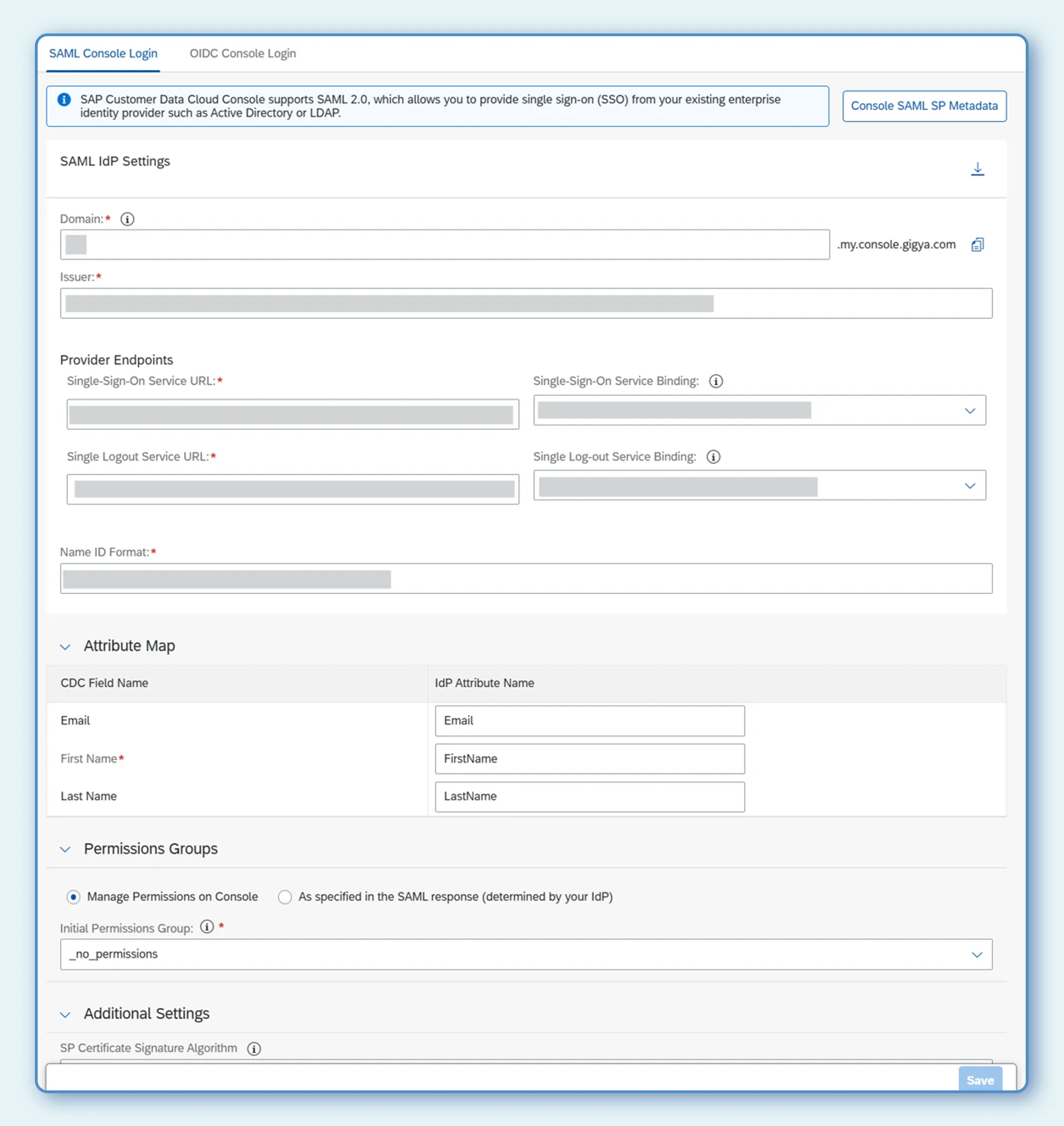 SAML IdP Settingsでは、SAML Console Login機能で管理コンソールへログインする場合のURLや利用するIDプロバイダの各種エンドポイントを設定します。
