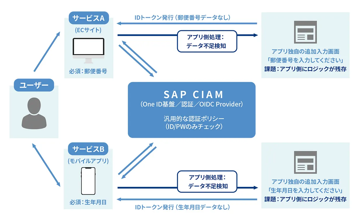 ID基盤側で認証を一元化できたとしても、各サービスがユーザーに求める情報は必ずしも同一ではありません。あるサービスでは「住所」が必須であり、別のサービスでは「生年月日」が必須となることがあります。