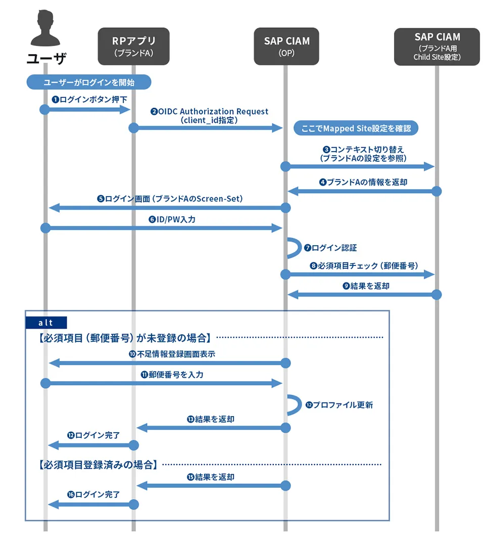 RPの設定で特段の指定を行わない場合、SAP CIAMは「親サイトのポリシー」で認証を完結させます。そのため、ユーザーがブランドA(RP 1)にログインしようとした際、たとえ郵便番号が未入力であっても、親サイトとしての認証が通ればトークンが発行されてしまいます。
