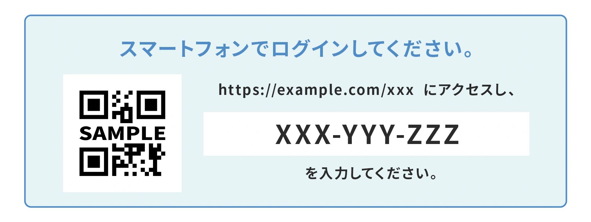 - 認証を行う端末(スマートフォンやPC):表示されたURLへアクセスし、ログイン、コード入力と認証を行う。