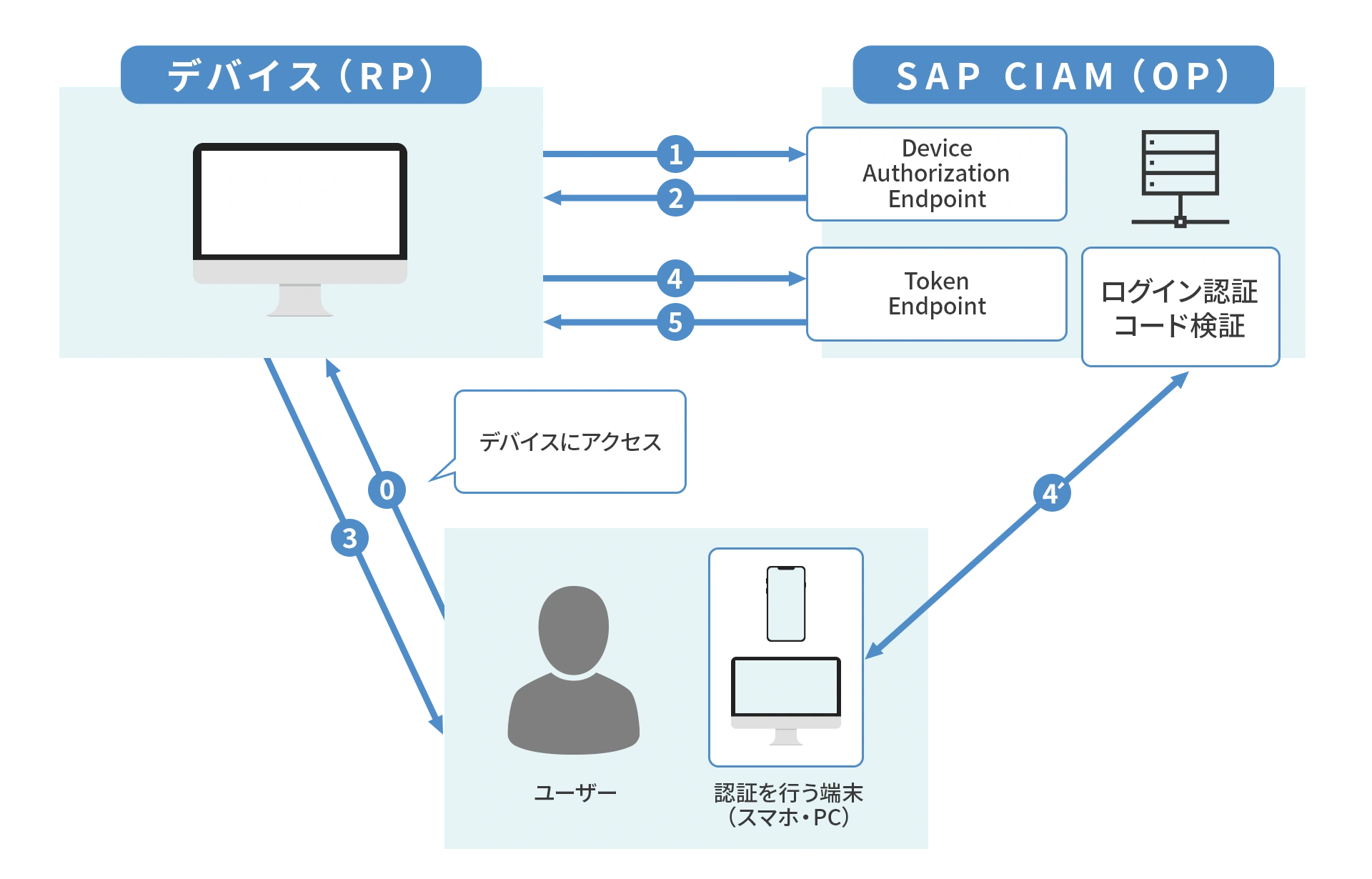 - デバイス(RP)はSAP CIAM(OP) に「Device Authorization Endpoint」をリクエストする。