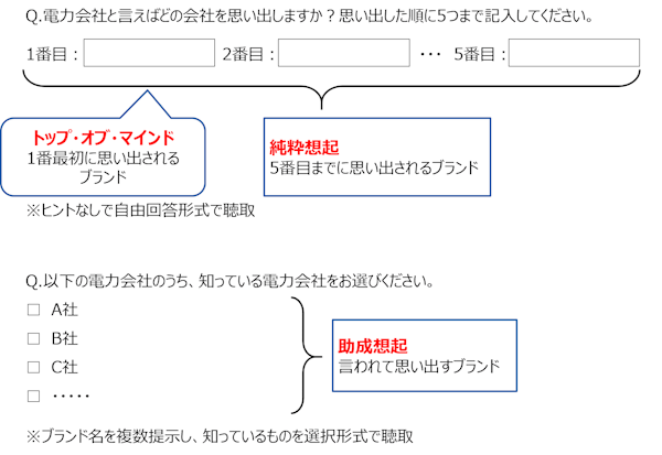 新電力のブランド認知度を分析するにあたり、ブランド認知を測る指標である「純粋想起」と「助成想起」について調査を行いました。純粋想起とはヒントなしにブランドを思い出すことをいい、自由回答形式で聴取します。純粋想起の中でも、1番最初に思い出されるブランドを「トップ・オブ・マインド」と呼びます。一方で助成想起とは、ブランド名を提示した上で知っているものを選択形式で聴取します。