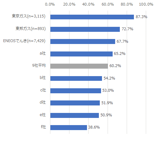 さらに、対象の9社の電力会社を列挙した上で、知っている電力会社(助成想起)を調査したところ、助成想起率の平均は60.2%となりました。トップは東京ガス(87.3%)、次いで東邦ガス(72.7%)、ENEOSでんき(67.7%)が続きました。