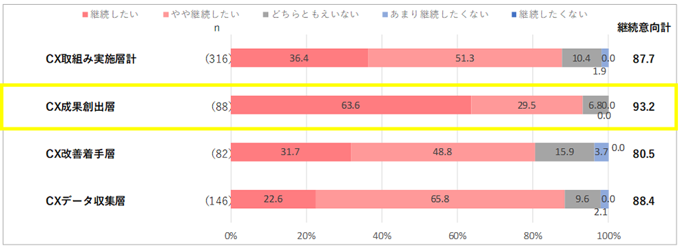 取組みの継続意向では、CX成果創出層は、「継続したい」63.6%、「やや継続したい」29.5%を合わせて、93.2%に達した。CX改善着手層、CXデータ収集層に比べて、「継続したい」が30~40pt高いのが特徴的であり、成果創出段階に入ると継続意向が顕著に高まることが推測される。