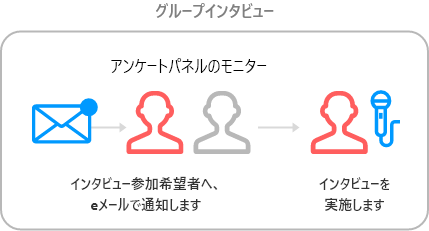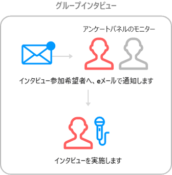 アンケートパネルのモニターから調査対象者をリクルーティング(募集)し、インタビュー調査を実施します。