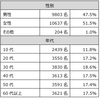 回答者の属性 | スクリーニング調査![]() ※各性年代1900s回収目標で回収後、不良回答を除外したサンプル数 本調査 ![]() |