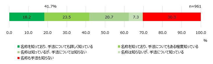 ソーシャルリスニング関連の業務領域に従事し、関連業務のニーズがある層で、ソーシャルリスニング認知者(名称・手法いずれか認知計)は69.7%。内訳は「ソーシャルリスニング名称・手法いずれも認知」が41.7%。「名称のみ認知」が20.7%、「手法のみ認知」が7.3%だった。