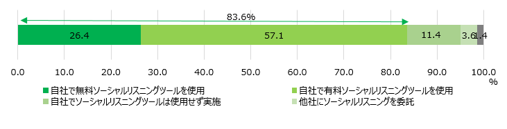 ソーシャルリスニングの実施方法については、「自社で有料ツールを使用」が57.1%、「自社で無料ツールを使用」が26.4%、「自社でツールを使用せず実施」が11.4%、「他社に委託」が3.6%、という結果となった。