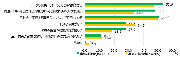 ■実施経験者の課題はデータ収集・分析にかかる労力・時間と専門スキル人材不足