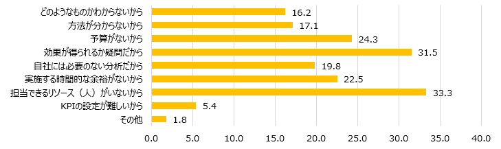 ソーシャルリスニング非実施かつ非意向層の非意向理由は「担当できるリソース(人)がいないから」が33.3%でトップ。次いで、「効果が得られるか疑問だから」(31.5%)、「予算がないから」(24.3%)が続いた。