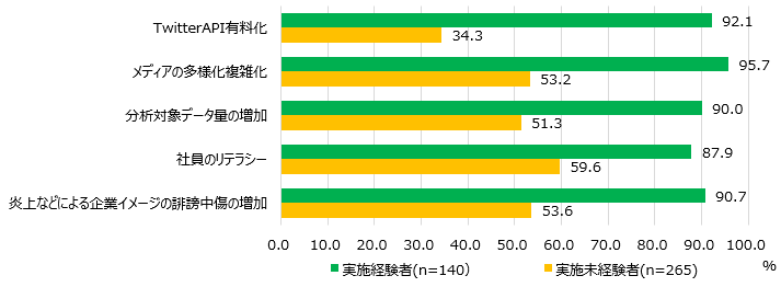 ソーシャルメディアに関して最近注視している環境動向は、ソーシャルリスニングを実施した層で、高い順に、「メディアの多様化複雑化」(95.7%)、「Twitter API有料化」(92.1%)、 「炎上などによる企業イメージの誹謗中傷の増加」(90.7%)、「分析対象データ量の増加」(90.0%)となった。